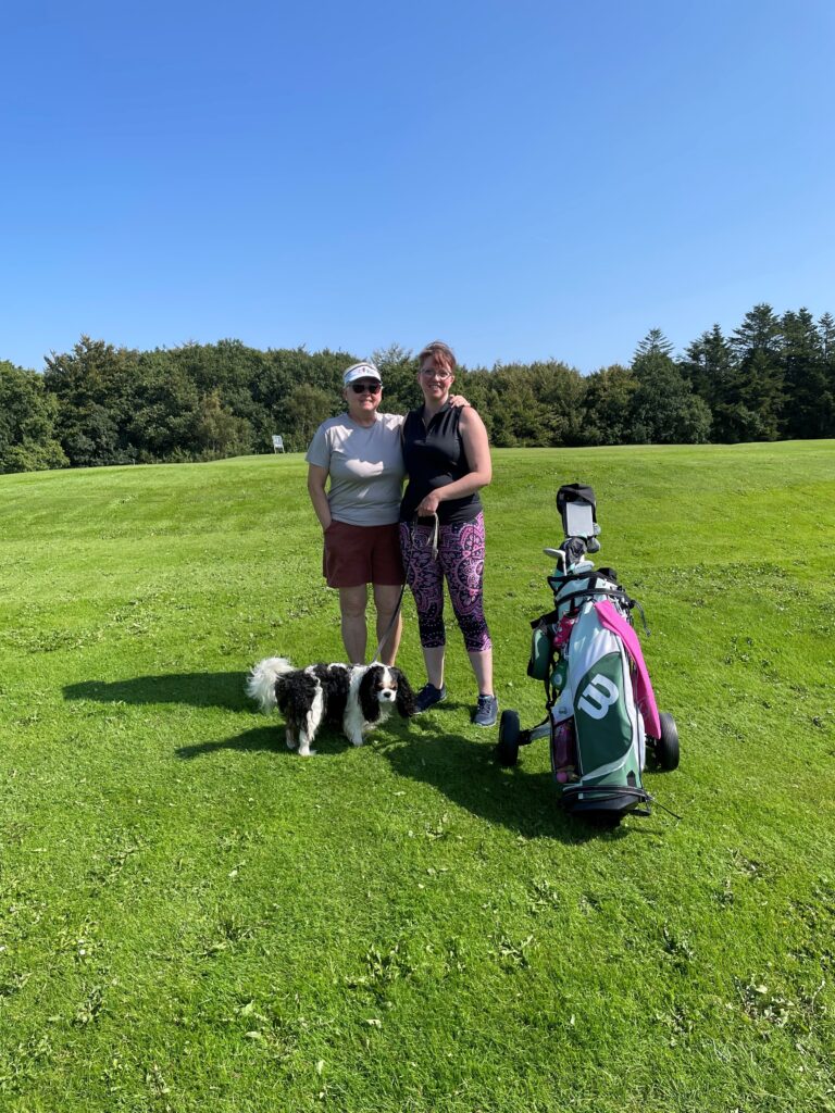 På billede ses Michelle til højre, sammen med Jytte Hansen, som er en af de 2 tovholdere i Kvinder & Golf forløbet, samt Alfie.
